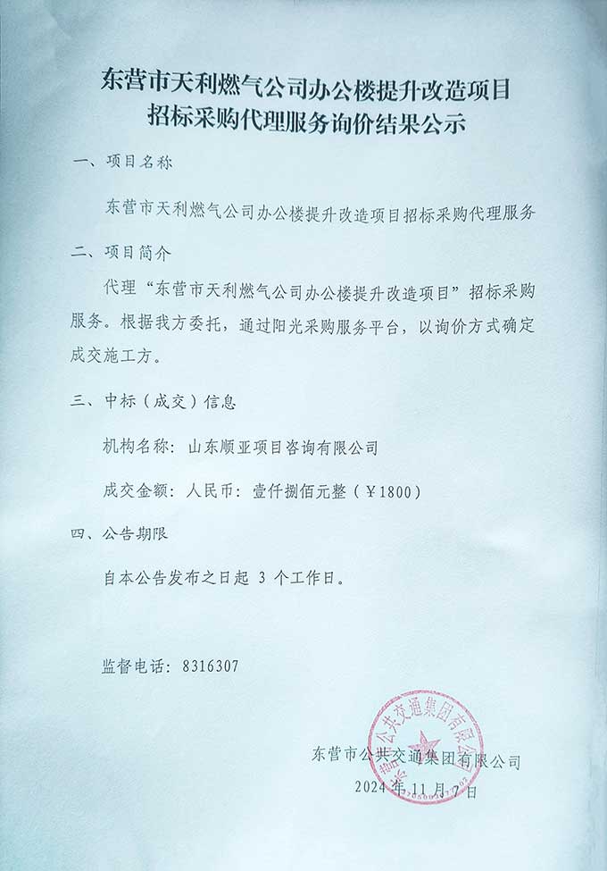 東營市天利燃氣公司辦公樓提升改造項目招標采購代理服務(wù)詢價結(jié)果公示