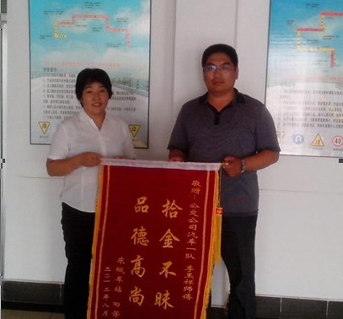2012年8月2,長(zhǎng)途總站東城車站職工田芳女士拿著一面寫有“拾金不昧、品德高尚”的錦旗來到市公交公司汽車一隊(duì),感謝車隊(duì)李玉祥師傅拾金不昧的高尚品德。