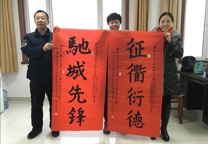 12月23日上午,家住雅苑小區(qū)的兩名乘客來到公交公司汽車六隊,將親手寫的三幅毛筆字作品交到了車隊工作人員手中。