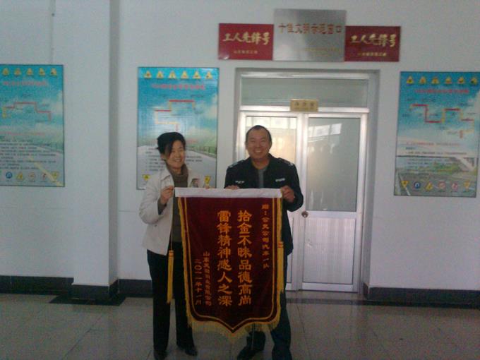 11月12日早上,山東天園銅業(yè)有限公司的耿愛華女士拿著一面寫有“拾金不昧品德高尚、雷鋒精神感人之深”的錦旗來到市公交公司汽車一隊,感謝車隊駕駛員王波師傅拾金不昧的高尚品德。據(jù)車隊了解得知,11月8日,耿愛華女士乘坐王波師傅駕駛的值班車上班。上班后發(fā)現(xiàn)裝有3000多元現(xiàn)金和手機的錢包不見了,她心急如焚,當(dāng)時就癱坐在地上。正在這時,耿愛華女士的一位同事前來告訴她丟失的錢包找到了,公交公司汽車一隊駕駛員王波師傅剛打來電話,錢包內(nèi)的3000多元現(xiàn)金和手機都在,讓她放心。原來,王波師傅執(zhí)行完任務(wù)回公司打掃車內(nèi)衛(wèi)生時,發(fā)現(xiàn)座位夾縫中有一個錢包,打開一看里面那么多現(xiàn)金,心想失主一定很著急,便通過錢包內(nèi)手機記錄的電話聯(lián)系到耿愛華女士的一位同事,讓她通知耿愛華女士及時到市公交公司汽車一隊領(lǐng)取。