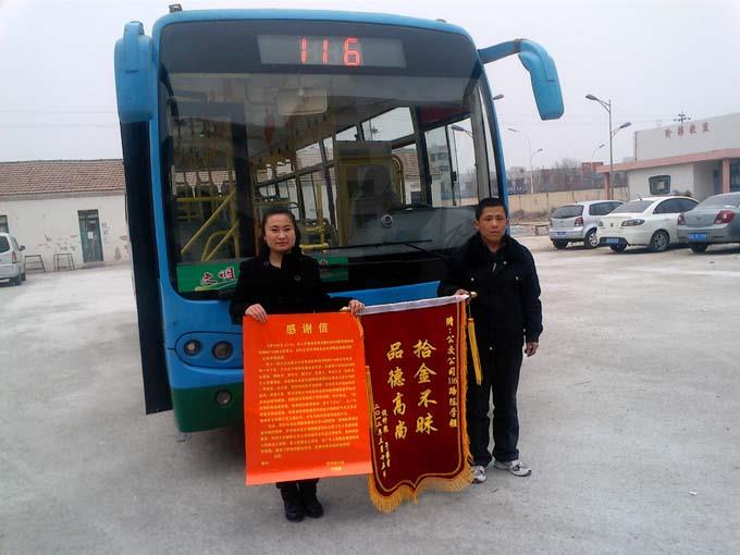 2012年3月14,勝利設(shè)計(jì)院職工于家星女士拿著一面寫(xiě)有“拾金不昧、品德高尚”的錦旗和感謝信來(lái)到市公交公司汽車(chē)四隊(duì),感謝116路魯E08350車(chē)駕駛員陳學(xué)強(qiáng)師傅拾金不昧的高尚品德。